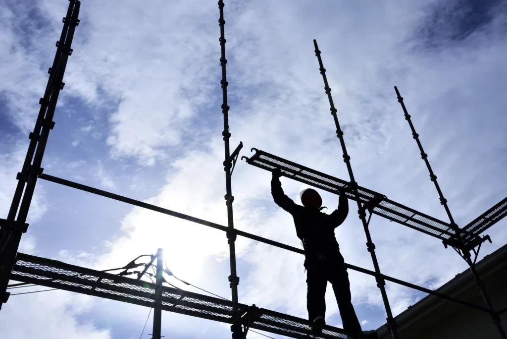 安全に作業を行うため足場を設置。その後、高圧洗浄で汚れやコケをしっかり除去します。